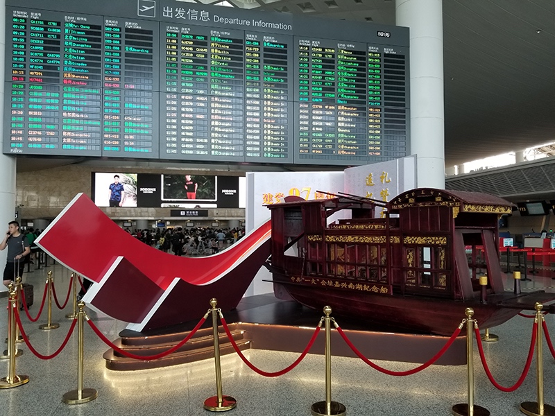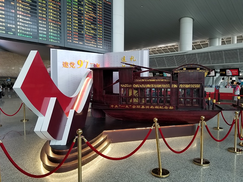 2018年7月1日,為紀念建黨97周年,傳承和弘揚紅船精神,航站區(qū)中心在T3航站樓出發(fā)層11號門對面空地引入“南湖紅船”模型,并對周邊場地進行美化布置,讓過往旅客感受新時代背景下“干在實處、走在前列、勇立潮頭”的浙江精神,深刻體會紅船精神的偉大意義,為航站樓積極營造文化氛圍添上濃厚的一筆“中國紅”,吸引旅客紛紛拍照留念。