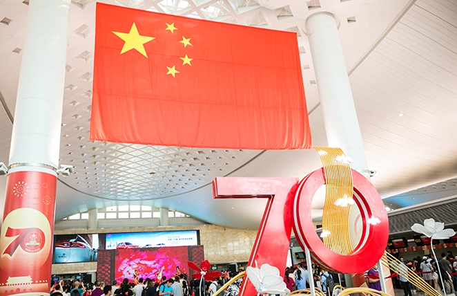 為慶祝新中國(guó)成立70周年,9月中旬,在T1、T2、T3航站樓出發(fā)層懸掛巨幅國(guó)旗、陳設(shè)國(guó)慶景觀布展,吸引了大批出行旅客合影留念,進(jìn)一步充實(shí)樓內(nèi)豐富多彩的國(guó)慶節(jié)日氛圍。9月30日上午,航站區(qū)中心聯(lián)合各單位在T3航站樓出發(fā)大廳舉辦以“這一抹中國(guó)紅”為主題的國(guó)慶文藝匯演。演出現(xiàn)場(chǎng)精心呈現(xiàn)了歌曲演唱、舞蹈表演、樂(lè)器演繹等10個(gè)表演節(jié)目,激揚(yáng)的歌聲、優(yōu)美的旋律、動(dòng)人的舞蹈和有趣的知識(shí)問(wèn)答互動(dòng),吸引了旅客駐足觀賞,共同慶祝新中國(guó)成立70周年,為祖國(guó)的繁榮昌盛送上最真摯的祝福。