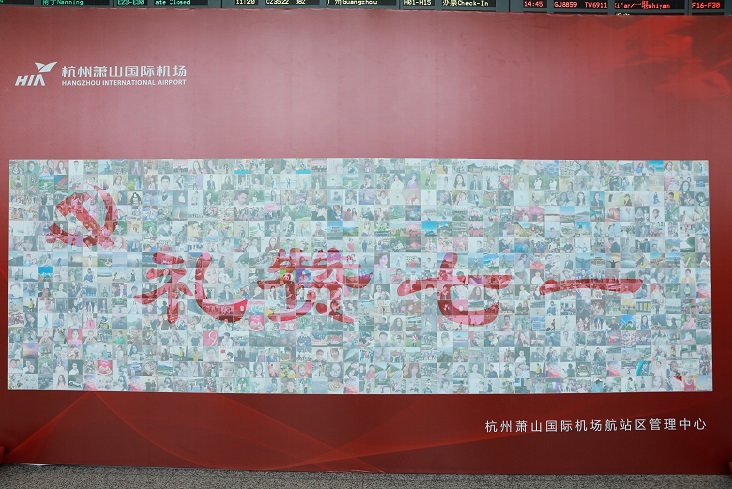 建黨99周年之際,航站區(qū)中心在T3航站樓出發(fā)層11號門內(nèi)開展了為期三天的“禮贊七一”大型拼圖互動活動。690名旅客的笑臉照片組成了本次活動DE 主題——“禮贊七一”,成為了航站樓內(nèi)一道奪目的紅色人文景觀。