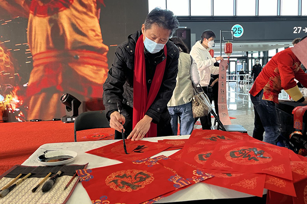 春節(jié)將至,1月11日,杭州機(jī)場開展“辭舊迎新 大展宏‘兔’”新春文化活動,邀請書法名家現(xiàn)場揮毫潑墨,為旅客寫春聯(lián)、送福字,營造濃厚過節(jié)氣氛,送上新春美好祝福。