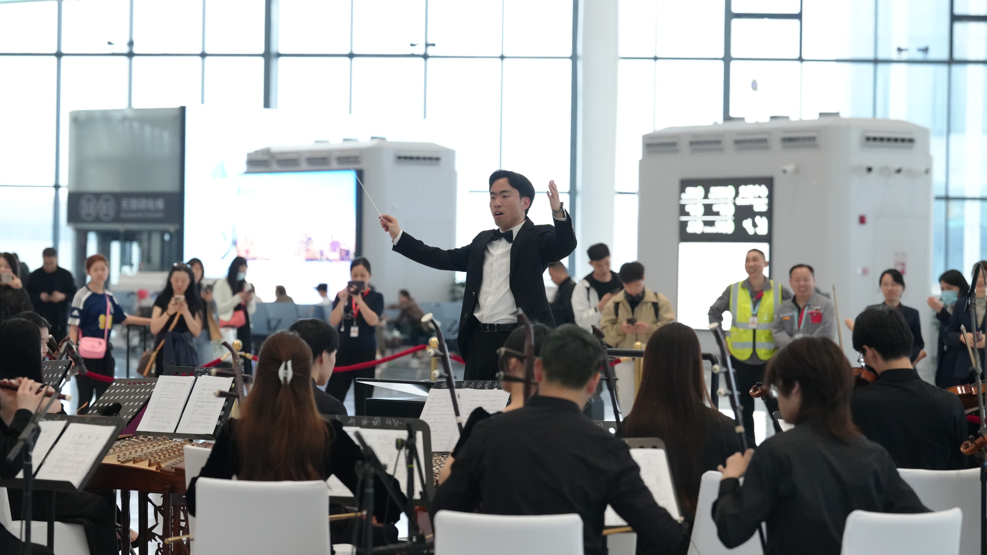 在浙江音樂學(xué)院MTC室內(nèi)樂團青年指揮家的帶領(lǐng)下,“嘈嘈切切”的琵琶聲、“樂器之王”的嗩吶聲、清脆悠揚的竹笛聲、余音繞梁的古箏聲等各類聲部,有機整合為同一主體,演繹著《瑤族舞曲》《云之南》等傳統(tǒng)經(jīng)典曲目和《權(quán)御天下》《上春山》等現(xiàn)代熱門國樂,引發(fā)旅客觀眾朋友們的陣陣掌聲。