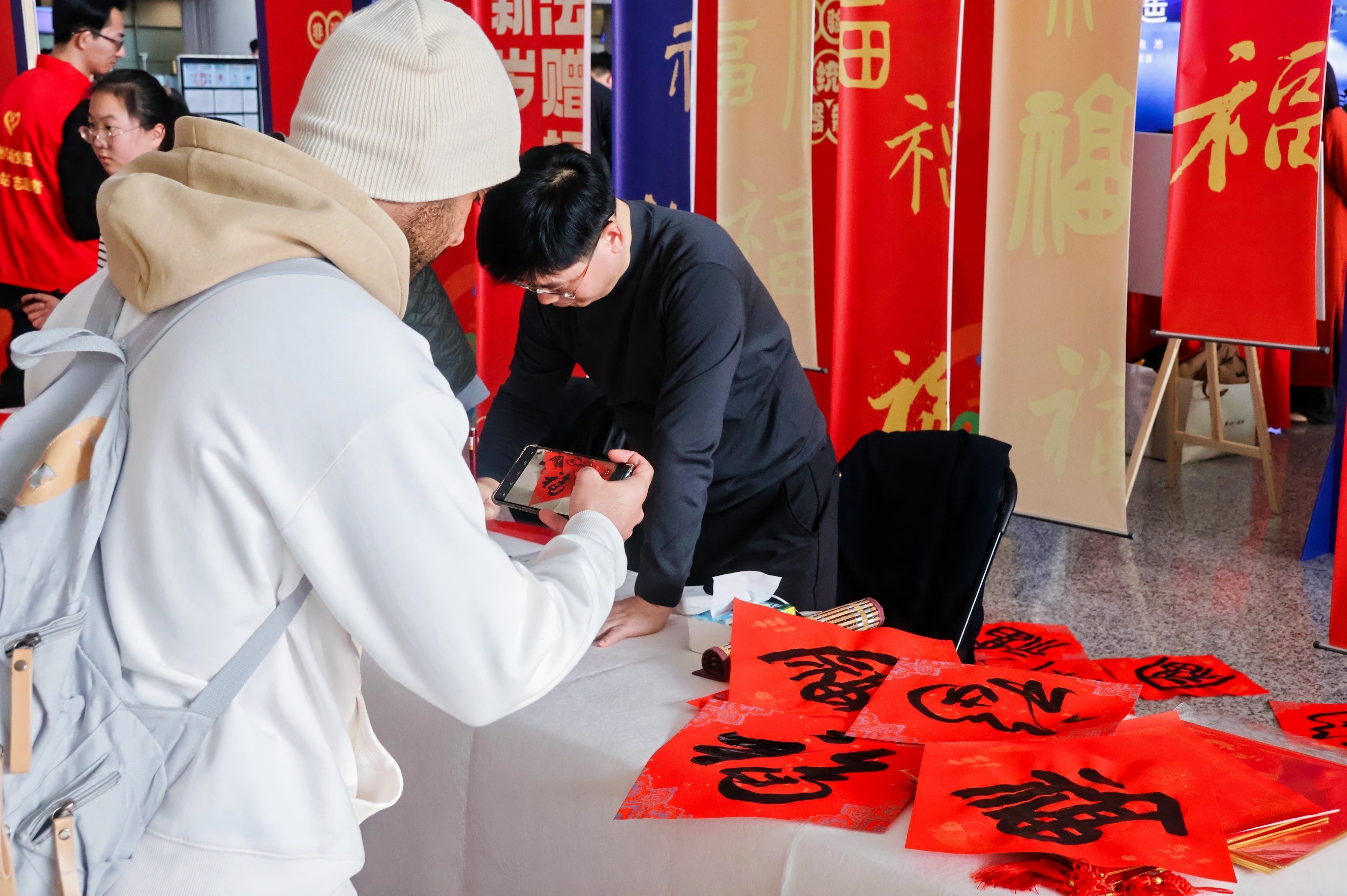 過新年,福字自不能少。專業(yè)書法老師揮毫潑墨,在喜慶的紅紙上寫下飽含祝福的字跡,為參與活動的旅客們送上一份新年好運(yùn)。