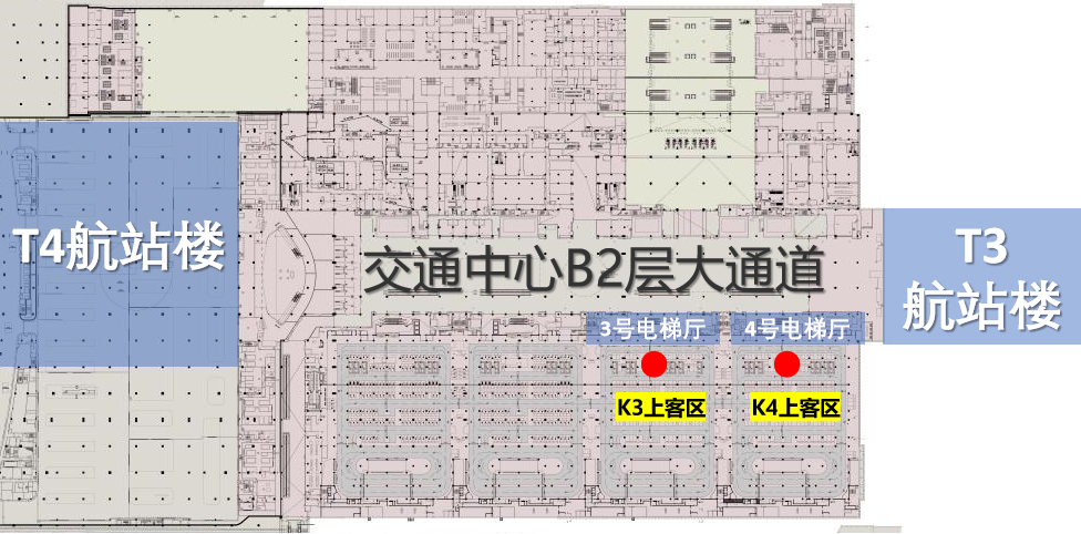 Passengers at Terminal 4 can descend to the B2 level from the 2F level of the Transportation Center using the escalators or vertical elevators following the signs.