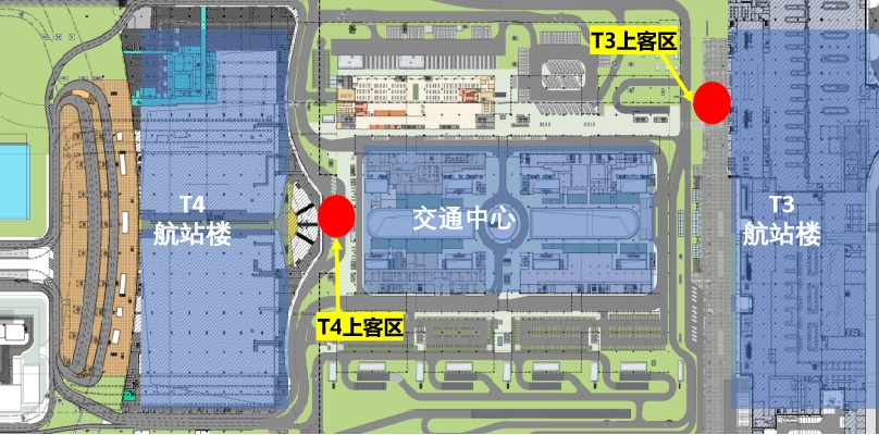 T4上客區(qū):位于T4航站樓與交通中心F1層連廊處。
